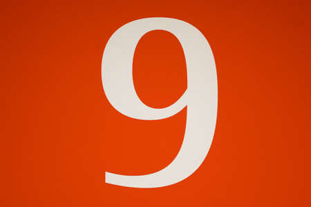 Colorful red and white sign with the number nine - 9 - stencilled in the centre in a full frame view
