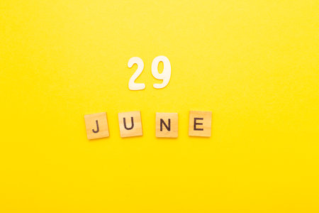 Top view of word 29 June made by wooden cubes on yellow color background