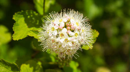 Blooming Physocarpus opulifolius bush in the garden, closeup