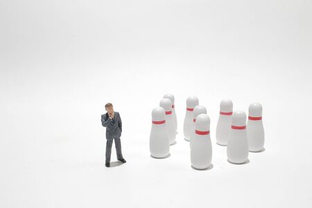 Miniature people : businessman and friend sitting with bowling pin ball,Business relax playing concept.