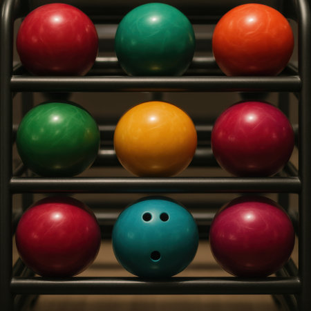 Row of bright bowling balls stored on metal rack in bowling hall. Warm studio style lighting and rich colors.