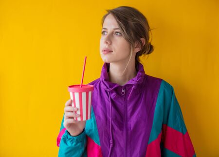 Young woman in 90s style clothes with cup on yellow background