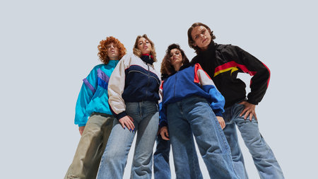 Low-angle image of a group of friends wearing oversized colorful windbreakers, retro jeans, exuding youthful energy and 90s charm.