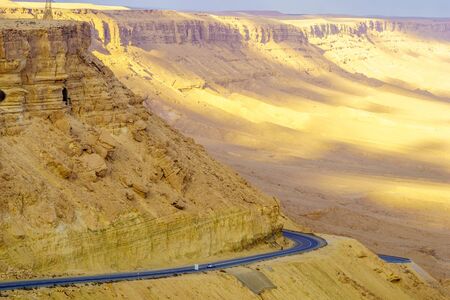 Landscape of Makhtesh (crater) Ramon, in the Negev Desert, Southern Israel. It is a geological landform of a large erosion cirque