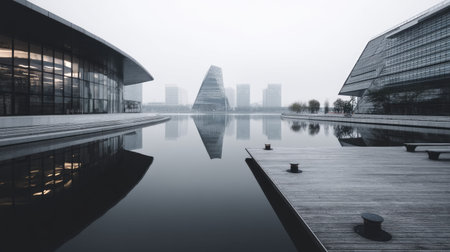 A tranquil urban scene showcases modern architecture reflected in still water, surrounded by a foggy atmosphere, creating a serene and minimalist landscape.