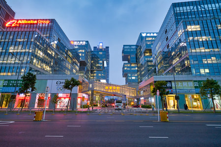 SHENZHEN, CHINA - APRIL 15, 2019: street level view of buildings in Shenzhen at dusk.