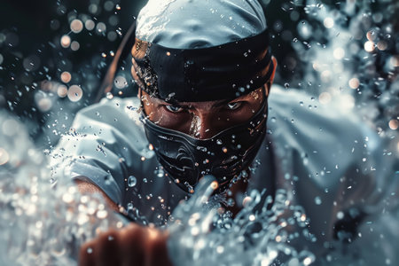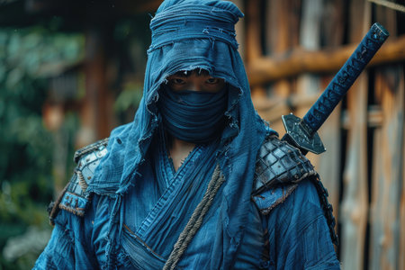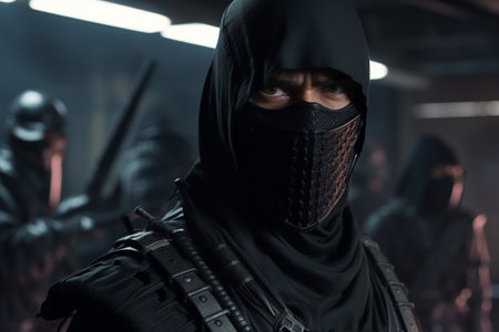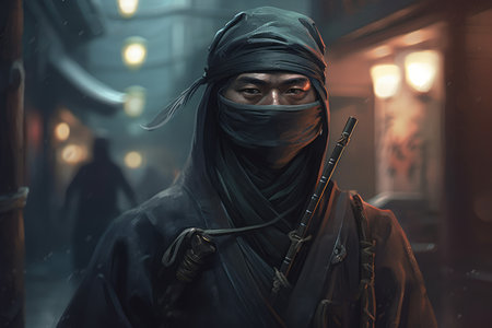 a male ninja with a black mask on his face covering his face. Generative AI