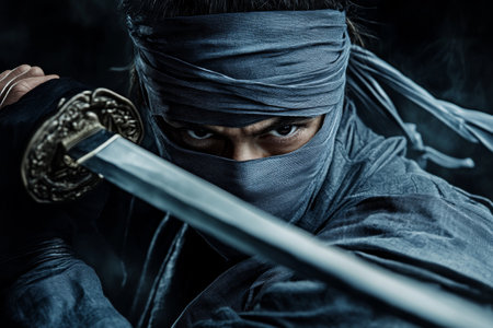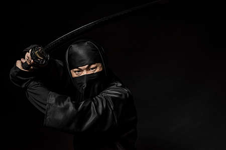 close up portrait of ninja in black mask with sword