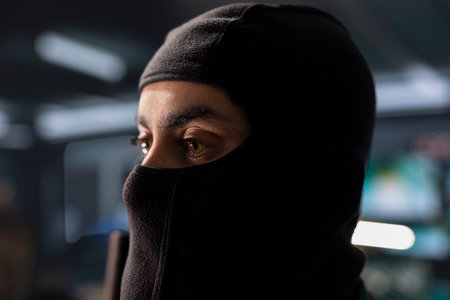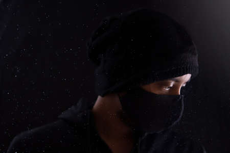 Criminal wearing black balaclava and hoodie in the dark