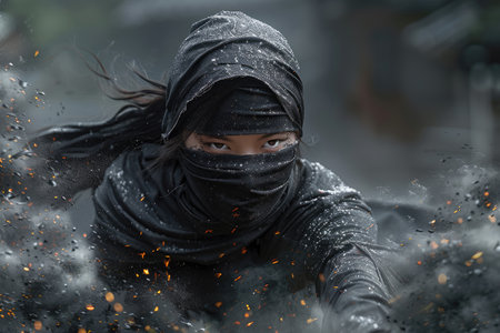 Shadow fighter ninja woman, a master of disguise, covert operations and strategic warfare, blending into her surroundings her objectives with expertise