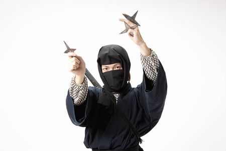 Asian Man Wearing Ninja Costume and holding Weapons