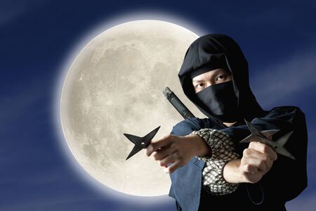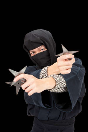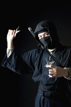 Male ninja with shuriken on black background