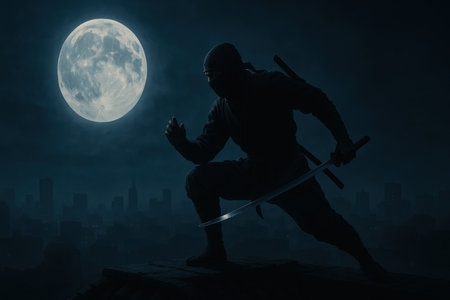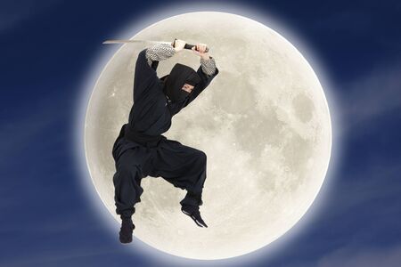 Silhouette of ninja with sword against the background of the moon