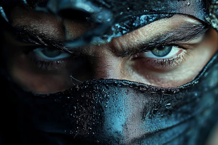 Intense gaze of a masked warrior in dramatic lighting during a nighttime setting