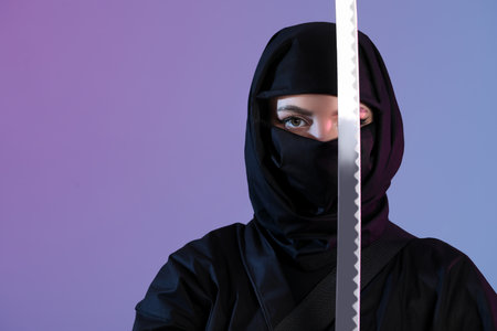 Female ninja with sword on color background