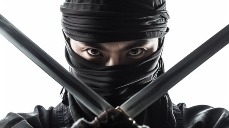 Intimidating ninja dressed in black, eyes piercing through the mask with crossed swords in front