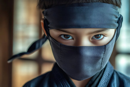 Portrait capturing a child dressed as a ninja, sporting a mask and headband, with an intense gaze reflecting determination and focus