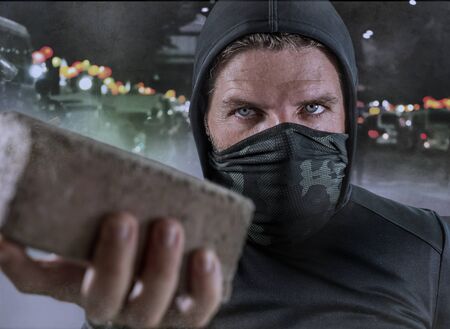 young man as ultra and radical anarchist rioter . furious antifa protester in face mask throwing brick hostile on street on demonstration in violet riot and chaos