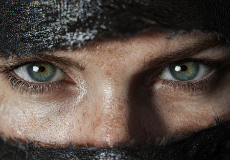 Mysterious eyes peering out from behind dark fabric