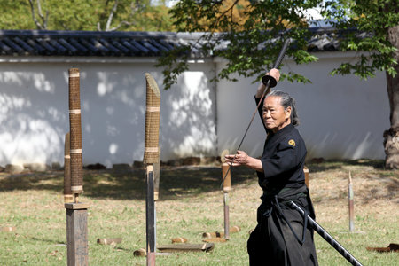 KAGAWA, JAPAN-OCTOBER 25: Katana sword fighters at Marugame Iai Festival, event dedicated to Japanese culture and tradition at Marugame-castle on October 25, 2015 in Japan.