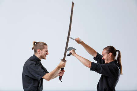 A ninja man with axes collided with an opponent with a sword on a gray background