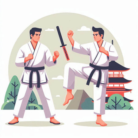 Taekwondo vector illustration. Two men in kimono practicing karate.