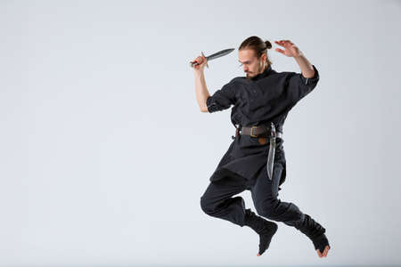 Fighting guy in black kimono fighter shows kudo technique on studio background with copy space, mix fight concept