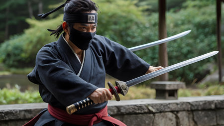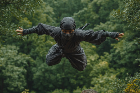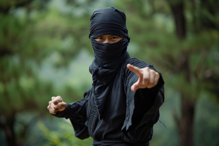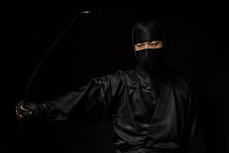 Proficient Japanese Ninja Warrior Showcases Expertise, Adorned In Stealthy Black Attire