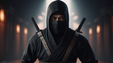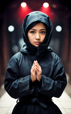 Shadow fighter ninja woman, a master of disguise, covert operations and strategic warfare, blending into her surroundings her objectives with expertise