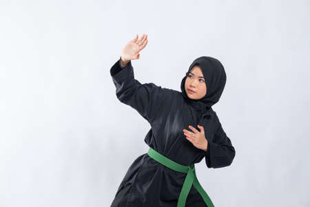 woman in hijab in pencak silat uniform poses stance and fend off attacks with copyspace