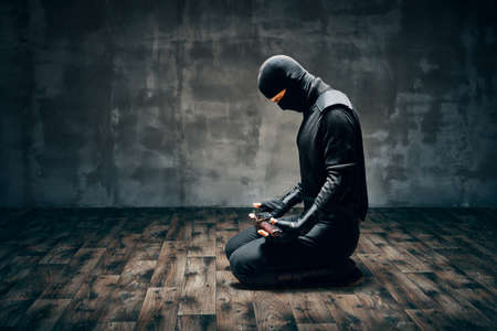 The ninja man crouched and stretched his leg out to stretch the muscles on a gray background