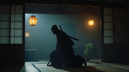 In the dim light of an ancient Japanese house, a shadowy ninja quietly navigates the darkened interior, showcasing stealth and agility.