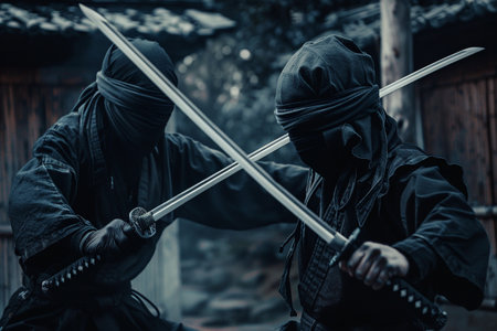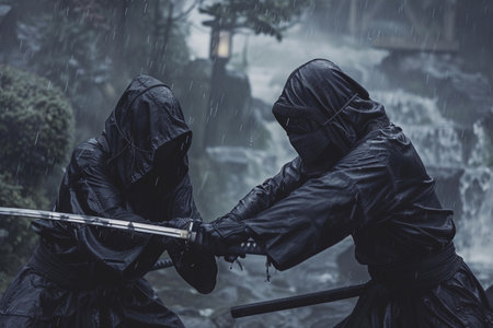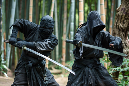 Two Skilled Swordsmen Spar In Traditional Japanese Garden, Demonstrating Kenjutsu Techniques.