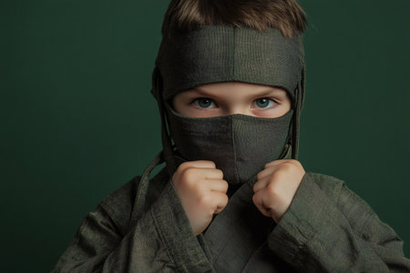 Young boy dressed in a ninja mask and martial arts outfit, embodying the spirit of a stealthy warrior against a dark green backdrop