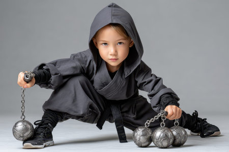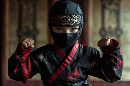 Child dressed as ninja performing martial arts in a traditional Japanese dojo, embodying strength and discipline