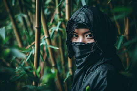 A ninja in dark clothing hides among the dense bamboo forest, exuding stealth, mystery, and traditional warrior skills.