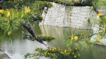 pine tree branch, moat and stone wall at nijo-jo castle in kyoto