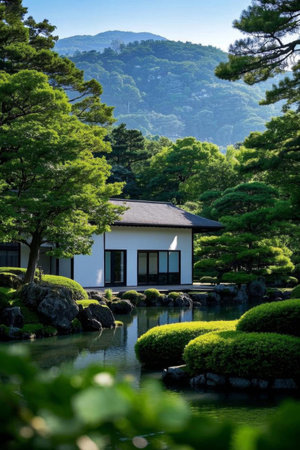 Aerial view of a serene Japanese garden featuring a traditional house surrounded by lush greenery and a tranquil pond, showcasing nature's beauty.