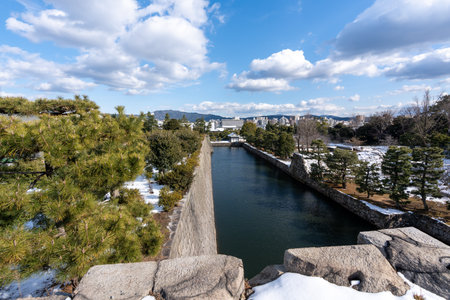 Nijo Castle Inner stone walls and moat with snow in winter. Kyoto, Japan.