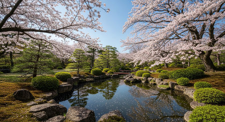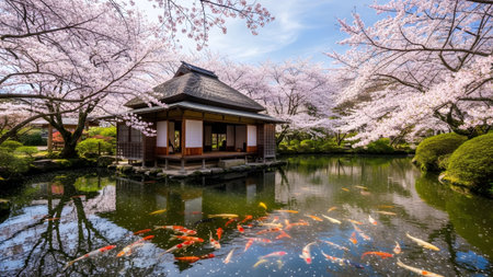 A serene traditional japanese garden with a beautiful pavilion, koi pond, and blooming cherry blossoms