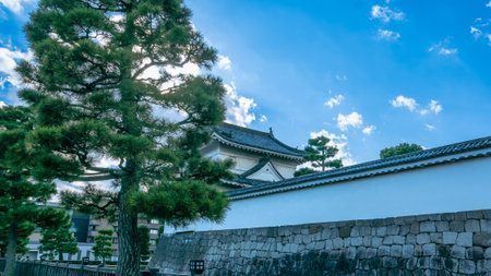 Lush green pine trees frame the white walls and stone base of Nijo Castle, set against a blue sky with white clouds. A peaceful view of this historic landmark, Kyoto, Japan.