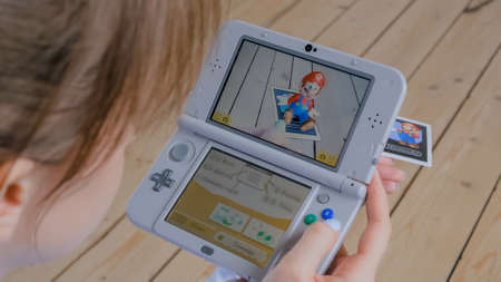 MOSCOW, RUSSIA - AUGUST 1, 2019. Woman gamer hand using grey handheld game console 3ds with augmented reality application - placing famous Nintendo character - Mario. Gaming, AR, technology concept