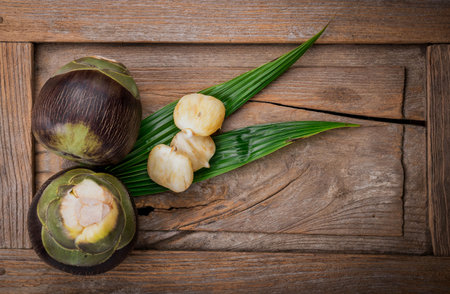 Asian Palmyra palm, Palmyra palm, Brab palm, Doub palm, Fan palm, Lontar palm, Toddy palm, Tala palm, Wine palm, fruit on wooden background.