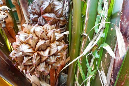 Closeup tropical tree pandanus odoratissimus fruit on sunlight in Thailand. Screw Pine, Pandanus tectorius, Pandanus odoratissimus, pandan pantai, tree with fruits in tropical forest that grows around the beach