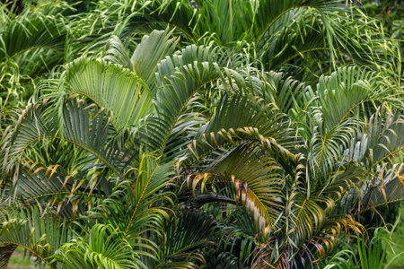 Brunches of palm tree. Green leaves background. Wallpaper with thin palm leaves