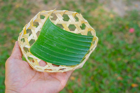 A North of Thailand rice plate meal served on a banana leaf, save the earth concept.