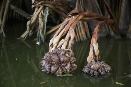 Nypa fruticans nuts growing on the mangroves in Pulau Ubin Singapore island closeup