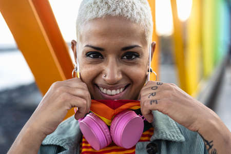Portrait of young woman wearing gay pride mask symbol of LGBTQ social community