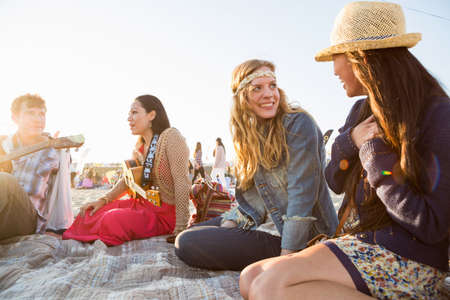 Two women of different ethnicities chatting while drinking tea sitting on a beach