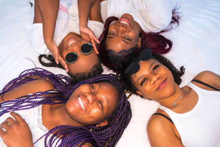 Lifestyle of friends in a hotel bed, friends of black ethnicity with sunglasses. Having fun and looking at each other. Photo from above